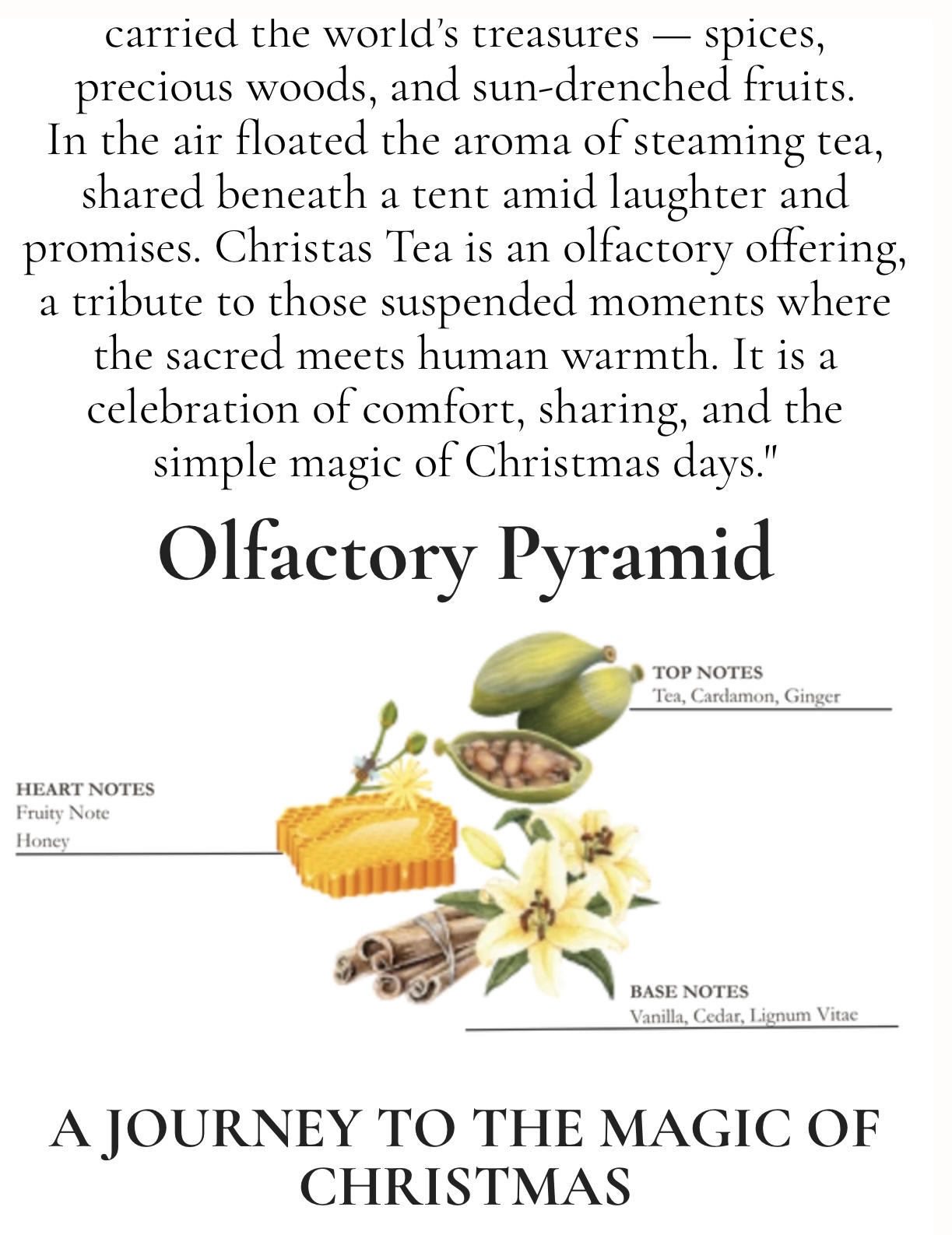 Envision this fragrance as a journey through the Orient, where caravans once transported spices, precious woods, and sun-kissed fruits. The aroma of steaming tea fills the air, shared beneath a tent filled with laughter. Christmas Tea is an olfactory tribute to those moments where the sacred meets warmth, celebrating comfort, sharing, and the magic of Christmas. Quantity Decrease quantity for Christmas Tea Scented Candle Increase quantity for Christmas Tea Scented Candle IN STOCK FRAGRANCE Top notes: Tea, Cardamom, Ginger Heart notes: Fruity Note, Honey Base notes: Vanilla, Cedar, Guaiac Wood 想像一下,這款香氛彷彿帶您踏上一段東方之旅,昔日商隊穿梭於此,運送著香料、珍貴木材和陽光親吻過的果實。熱氣騰騰的茶香瀰漫在空氣中,人們在充滿歡笑的帳篷下共享茶香。 「聖誕茶」香氛是對那些神聖與溫暖交融的時刻的嗅覺致敬,歌頌著舒適、分享和聖誕節的魔力。 數量 減少「聖誕茶」香氛蠟燭的數量 增加「聖誕茶」香氛蠟燭的數量 有貨 加入購物車 查看店面資訊 香氛成分 前調:茶、小荳蔻、薑 中調:果香、蜂蜜 基調:香草、雪松、癒創木 植物成分