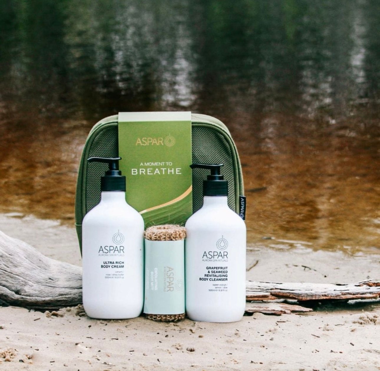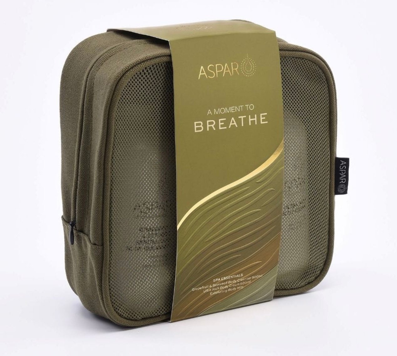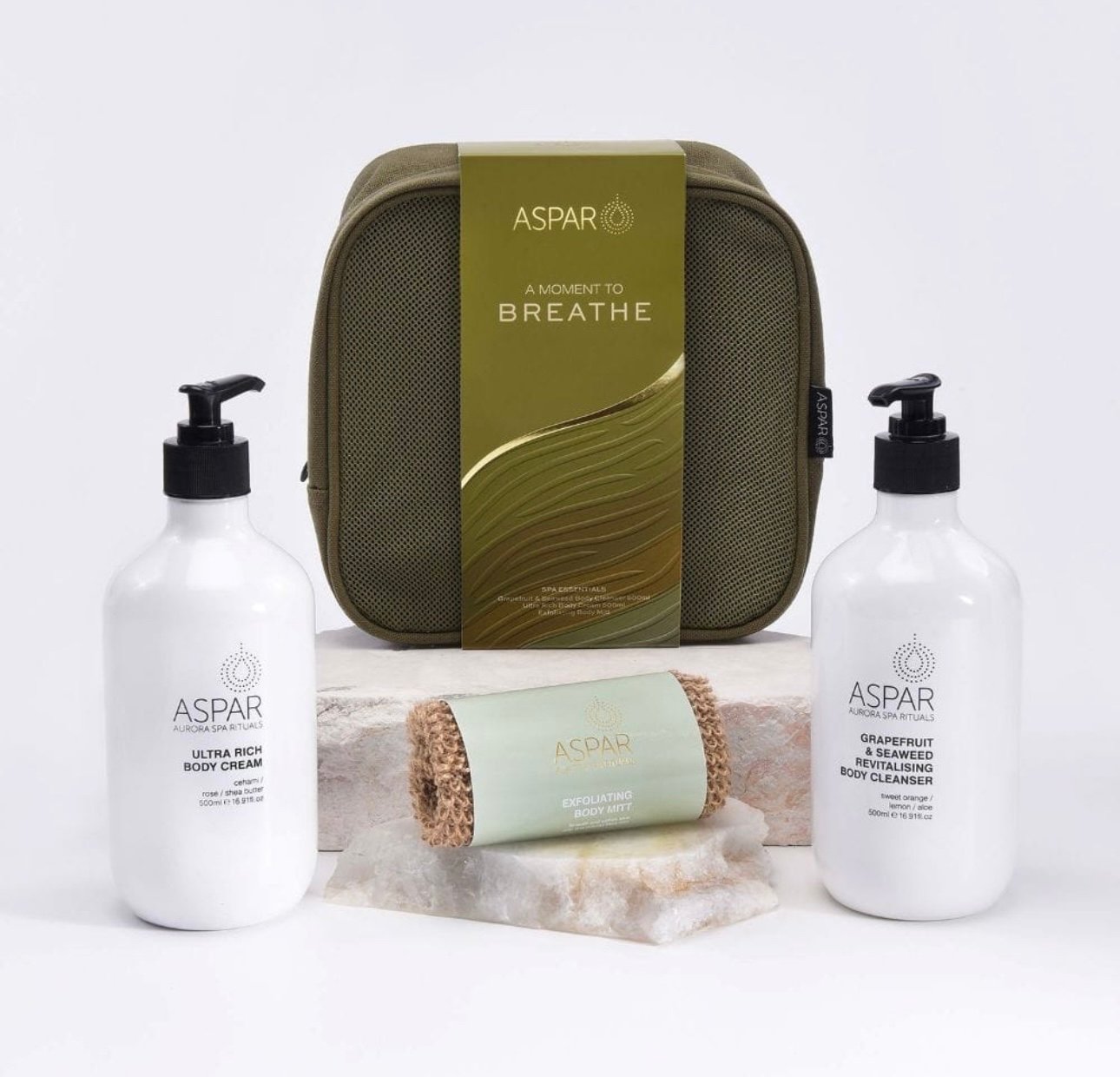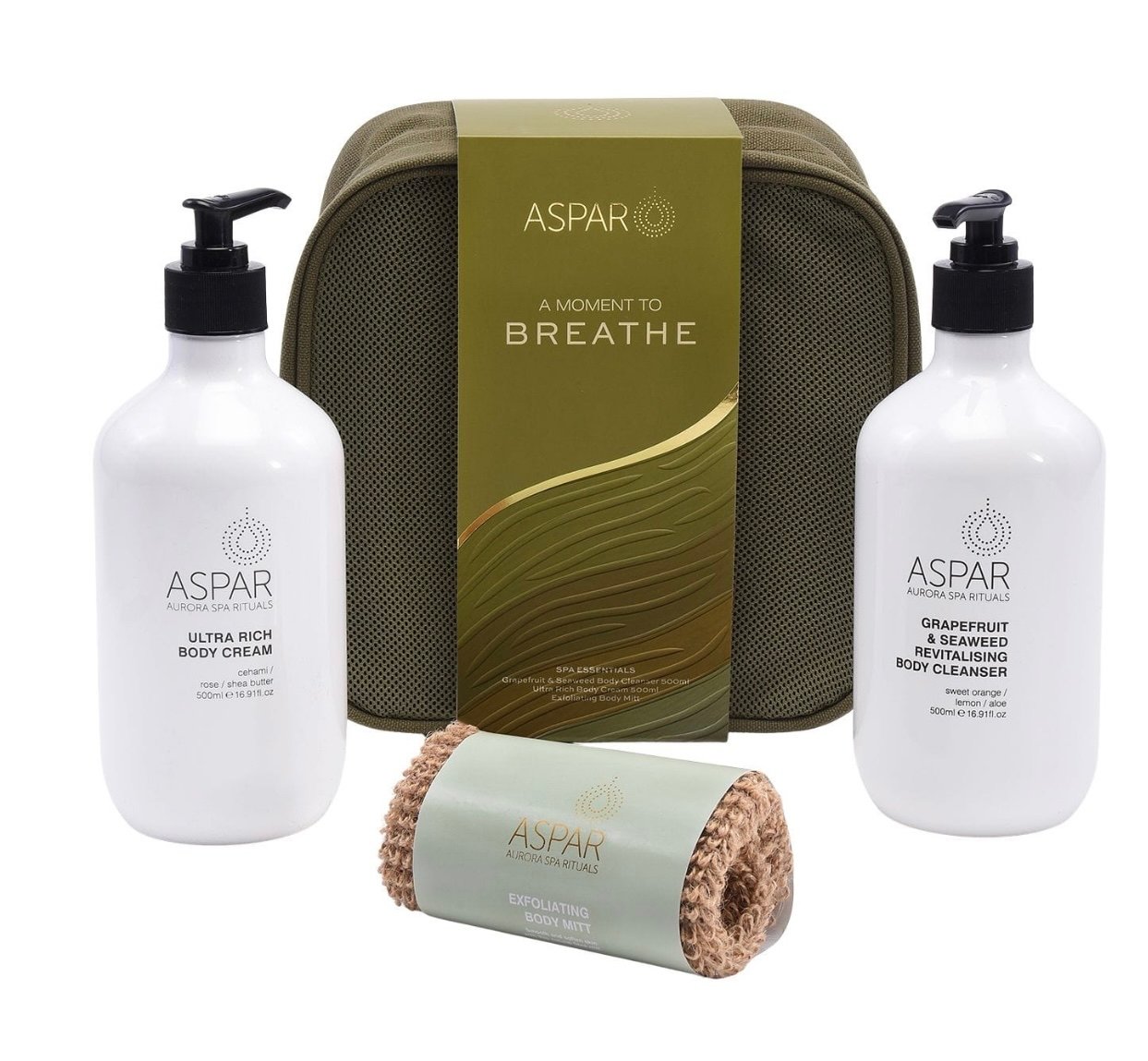 ASPAR invites you to take a moment to breathe and create space for renewal with our body spa ritual. Awaken your senses with our signature blend of essential oils, while botanically active ingredients work to purify, hydrate and replenish the skin, transforming your daily shower or bath into a revitalising self-care ritual. Presented in an olive-green canvas cosmetics bag with a mesh front, perfect for travel or storing essentials. A thoughtful gift for yourself or someone who would welcome an uplifting and refreshing moment to begin their day. Gift a moment to BREATHE. SET INCLUDES Grapefruit & Seaweed Revitalising Body Cleanser 500ml Ultra Rich Body Cream 500ml Exfoliating Body Mitt SPA RITUAL This is your moment to Breathe. Begin with the Grapefruit & Seaweed Body Cleanser, lathering as you breathe in the uplifting citrus blend to invigorate and refresh. Rinse away impurities and emerge renewed, with aloe vera and seaweed extract leaving skin nourished and revitalised. Pair with the Exfoliating Body Mitt, using circular motions to boost cell renewal and reveal smooth, radiant skin. Use dry to support lymphatic drainage and detoxification. Finish by massaging the Ultra Rich Body Cream, enriched with a five-oil botanical blend, to nourish and protect. Allow the Sandalwood and Geranium to calm your senses and release tension with every deep breath. INGREDIENTS GRAPEFRUIT & SEAWEED BODY CLEANSER: Aqua (Water), Aloe Barbadensis Leaf Juice, Sodium Lauroyl Sarcosinate, Lauryl Glucoside, Hydroxyethylcellulose, Citrus Paradisi (Grapefruit) Peel Oil, Citrus Aurantium Dulcis (Sweet Orange) Peel Oil, Citrus Limon (Lemon) Peel Oil, Cananga Odorata (Ylang Ylang) Flower Oil, Ascophyllum Nodosum (Seaweed) Extract, Phenoxyethanol, Benzyl Alcohol, Citric Acid, Citral*, Linalool*, d-Limonene*. *component of essential oil. ULTRA RICH BODY CREAM: Aqua (Water), Caprylic/Capric Triglyceride, Steriac Acid, Glyceryl Stearate SE, Isopropyl Myristate, Dimethicone, Cetearyl Alcohol, Cyclopentasiloxane, Butyrospermum Parkii (Shea Butter), Cyclohexasiloxane, Macadamia Ternifolia Seed Oil, Olea Europaea (Olive) Fruit Oil, Triticum Vulgare (Wheat) Germ Oil, Vitis Vinifera (Grape) Seed Oil, Calendula Officinalis Flower Extract, Centipeda Cunninghammi (Cehami) Extract, Hellanthus Annunuus (Sunflower) Seed Oil, Daucus Carota Sativa (Carrot) Seed Oil, Lavandula Angustifolia (Lavender) Oil, Pelargonium Graveolens (Rose Geranium) Flower Oil, Fusanus Spicatus (Sandalwood) Wood Oil, Rosa Damascena (Rose) Flower Oil, Tocopheryl Acetate, Carbomer, Potassium Cetyl Phosphate, Triethanolamine, Citric Acid, Benzyl Alcohol, Phenoxyethanol, Linalool*, Citronellol*, d-Limonene*. *component of essential oil . EXFOLIATING BODY MITT: Natural Ramie Fibres Care: We recommend machine washing your mitt regularly, and allowing to completely dry after use. ASPAR 誠摯邀請您抽出片刻時間,深呼吸,透過我們的身體水療儀式煥發活力。 我們獨家調配的精油喚醒您的感官,植物活性成分則能淨化、滋潤並補充肌膚,將您日常的淋浴或泡澡變成一次煥活身心的自我護理儀式。 產品裝在橄欖綠帆布化妝包中,正面採用網狀設計,方便旅行攜帶或收納必備用品。 無論是送給自己,或是送給渴望以煥然一新的感覺開啟美好一天的人,這都是一份貼心的禮物。 贈予片刻的呼吸時光。 套裝包含: 葡萄柚海藻煥活沐浴露 500ml 滋潤身體乳 500ml 去角質身體手套 水療儀式 此刻,是屬於您的呼吸時刻。 首先使用葡萄柚海藻沐浴露,搓揉起泡,同時深呼吸,感受令人精神煥發的柑橘香調,煥發活力,倍感清爽。洗去雜質,煥發新生。蘆薈和海藻萃取物讓肌膚倍感滋養,重現活力。 搭配去角質身體手套,以打圈的方式按摩,促進細胞更新,展現出光滑透亮的肌膚。乾用有助於淋巴引流和排毒。 最後,按摩富含五種植物精油的滋養潤膚霜,滋養並保護肌膚。檀香和天竺葵的香氣,伴您深呼吸,舒緩身心,釋放壓力。 成分 葡萄柚海藻沐浴露:水、庫拉索蘆薈葉汁、月桂酰肌氨酸鈉、月桂基葡糖苷、羥乙基纖維素、葡萄柚皮油、甜橙皮油、檸檬皮油、依蘭花油、海藻萃取物、苯氧乙醇、苯甲醇、檸檬酸、檸檬醛*、芳樟醇*、d-檸檬水*。 *精油成分。 超滋潤身體乳:水、辛酸/癸酸三酸甘油酯、硬脂酸、甘油硬脂酸酯SE、肉荳蔻酸異丙酯、聚二甲基矽氧烷、鯨蠟硬脂醇、環戊矽氧烷、乳木果油、環己矽氧烷、澳洲堅果籽油、油橄欖油、小麥胚芽油、葡萄籽油、金盞花萃取、日本蜈蚣萃取物、向日葵籽油、胡蘿卜籽油、薰衣草油、玫瑰天竺葵花油、檀香木成分:玫瑰花油、大馬士革玫瑰花油、生育酚乙酸酯、卡波姆、鯨蠟基磷酸鉀、三乙醇胺、檸檬酸、苯甲醇、苯氧乙醇、芳樟醇*、香茅醇*、d-檸檬烯*。 *精油成分。 去角質身體手套:天然苧麻纖維 保養:建議定期機洗,並在使用後徹底晾乾。
