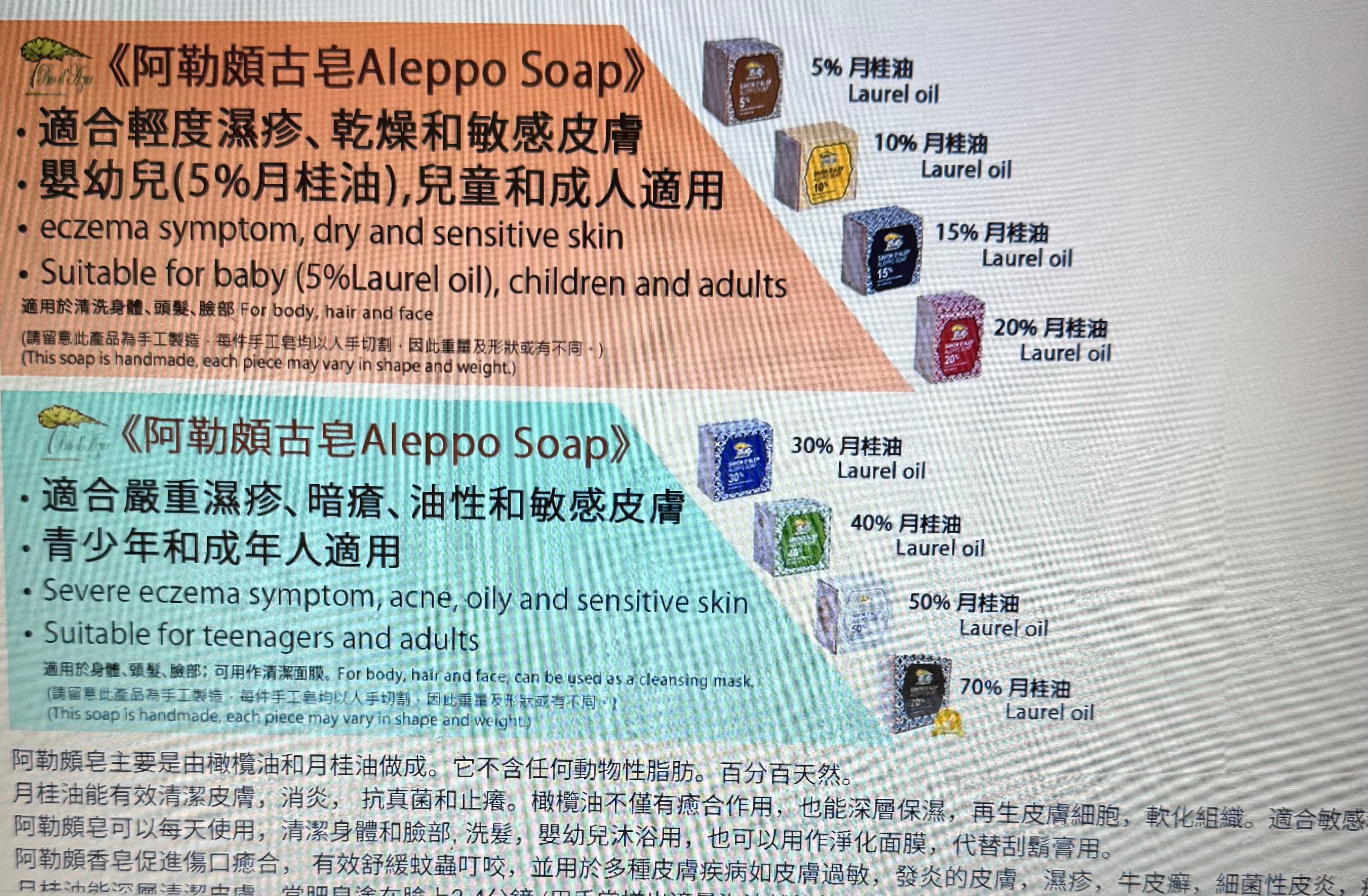 100% NATURAL ORIGIN MADE IN ALEPPO 190g Authentic Aleppo soap enriched with 40% laurel berry oil. The top choice for caring for demanding and delicate skin. THE TRUE "GREEN GOLD" OF THE ALEPPO PEOPLE An authentic and traditional soap, combining the moisturizing virtues of olive oil and the purifying properties of laurel berry oil (40%). This famous cube, cooked in a cauldron and dried for 9 months, reveals a green heart filled with natural actives. Made in Aleppo according to ancient know-how, it is ideal for the most demanding skins. INCI Sodium olivate Aqua (water) Glycerin Sodium hydroxide INGRÉDIENTS Olive oil saponified Laurel berry oil saponified Water Hydrating agent Traces of lye from saponification 100% naturally sourced. In the bath, under the shower, or as part of a hammam ritual: leave on for a few moments, then gently rub. Application: Lather the soap between your hands or directly on damp skin, leave on for a few moments and then rinse thoroughly. Tip: Aleppo soap lathers little because it does not contain palm or coconut oil. Use a washcloth or sponge for more lather. Caution: Avoid contact with eyes. Remarkably rich in bay laurel oil (40% when cooked), this Aleppo soap is recommended for difficult and very delicate skin, helping to maintain proper hydration. 40% bay laurel oil: ultra purifying and soothing properties. Olive oil: moisturizes and protects sensitive and problematic skin. Gentle cleansing: respects the skin's natural balance. Size: 200g bar, wrapped in eco-friendly and practical paper packaging. 正宗阿勒頗香皂,富含40%月桂果油。呵護嬌嫩肌膚的首選。 阿勒頗人民的真實“綠黄金” 這款正宗的傳統香皂,融合了橄欖油的保濕功效和月桂果油(40%)的淨化功效。 這款著名的方塊香皂,在大鍋中烹製,歷經9個月風乾,露出富含天然活性成分的綠色內核。 這款香皂採用阿勒頗古老的工藝精製而成,是呵護肌膚的理想之選,即使是最挑剔的肌膚也能安心使用。 沐浴時、淋浴時或土耳其浴時:停留片刻,然後輕輕揉搓。 使用方法:將肥皂在掌心或直接塗抹於濕潤的皮膚上,揉搓起泡,停留片刻,然後徹底沖洗乾淨。 小貼士:阿勒頗肥皂不含棕櫚油或椰子油,因此泡沫較少。請使用毛巾或海綿來獲得更多泡沫。 注意:避免接觸眼睛。 這款阿勒頗香皂富含月桂油(煮熟後含量高達40%),適用於敏感肌膚和嬌嫩肌膚,幫助肌膚保持水分。 40%月桂油:超強淨化和舒緩功效。 橄欖油:滋潤並保護敏感肌膚和問題肌膚。 溫和清潔:尊重肌膚的自然平衡。 規格:190g採用環保實用的紙質包裝。 濕疹皮肤適用,治疗性皂