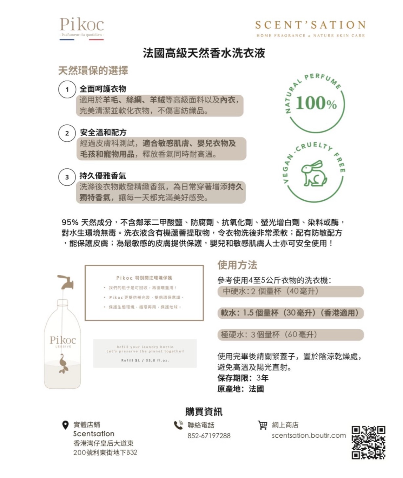 Pikoc 法國洗衣液 1L Pikoc由法國香水師創立於巴黎,以高端天然香氛為核心。95%天然成分,不含鄰苯二甲酸鹽、防腐劑、抗氧化劑、染料、酶,對水生環境無毒。洗衣液含有機蘆薈提取物,令衣物洗后非常柔軟;同时洗衣液配有防敏配方,能保護皮膚;可以為最敏感的皮膚提供保護,嬰兒和敏感肌膚人士亦可安全使用! 洗衣液配方是適合所有紡織品,毛絨、羊毛或合成服装 配方95%全天然,你也可以用手洗,而且安全安心使用! 4到5公斤衣物的洗衣機: - 2個量杯(40毫升)用於中水 - 1.5個軟水量杯(30毫升) - 3個量杯(60毫升)用於非常硬的水 付款、送貨及退貨 + Made in France